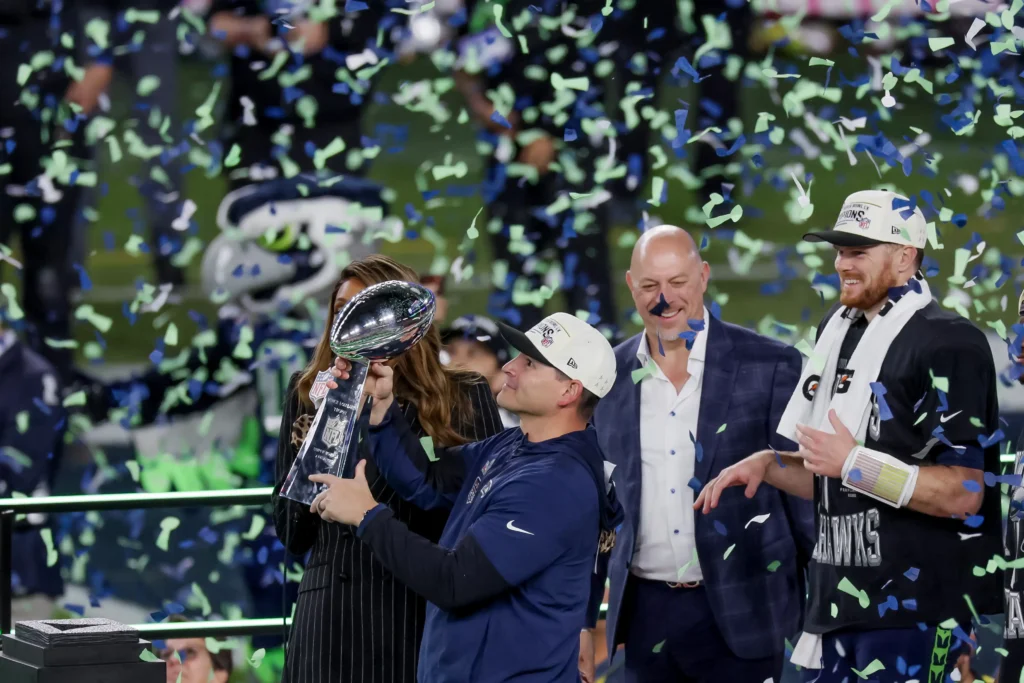 El entrenador de los Seahawks, Mike MacDonald (segundo izquierda), sostiene el Trofeo Vince Lombardi después de que los Seahawks derrotaran a los New England Patriots con un marcador de 29-13. (Foto EFE)